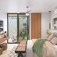 Esta propiedad se caracteriza por contar con espacios prácticos y funcionales para la vida cotidiana con una amplia habitación con baño propio con opción de estar en planta baja con piscina privada, además de la terraza con área de asadores en el rooftop para uso de todos los habitantes.