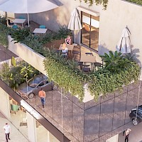 Mira contará con 13 exclusivos departamentos ubicados en el cuarto y quinto nivel. El modelo Terraza 1 cuenta con dos amplias habitaciones cada una con baño propio y una tercera recámara con acceso independiente.