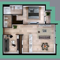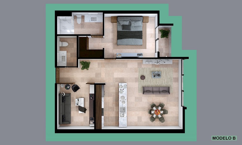 El modelo B, se caracteriza por tener una distribución con una habitación muy amplia y un área social muy cómoda con medio baño de visitas + un flex room