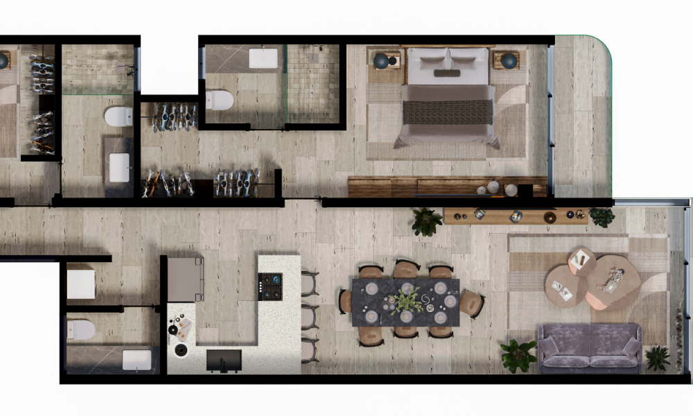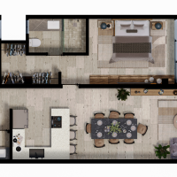 El modelo A se caracteriza por contar con dos habitaciones y un área de sala-comedor con vistas a la terraza.