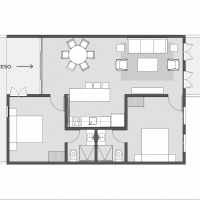 Este modelo se caracteriza por tener dos habitaciones con baño y clóset, además de una estancia cómoda con una terraza amplia techada.