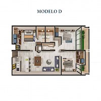 El desarrollo estará conformado de 94 departamentos divididos en 2 torres, cada una de tres niveles. El modelo D se caracteriza por contar con tres habitaciones y estar ubicado en planta baja de la torre.