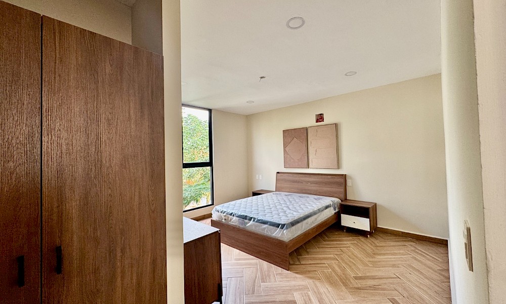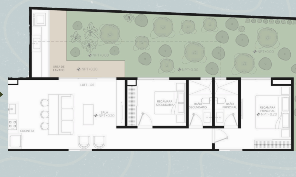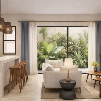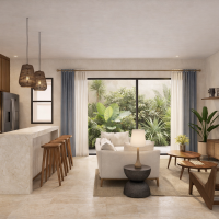 Este modelo se caracteriza por tener dos habitaciones y dos baños en planta baja con un área de jardín privado.