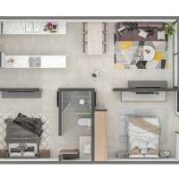 El modelo B3 se caracteriza por contar con dos amplias habitaciones cada una con baño propio y el área de sala-comedor con vistas a la terraza privada.