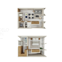 Este modelo se caracteriza por tener una habitación y estar distribuído en 2 pisos.