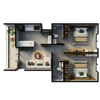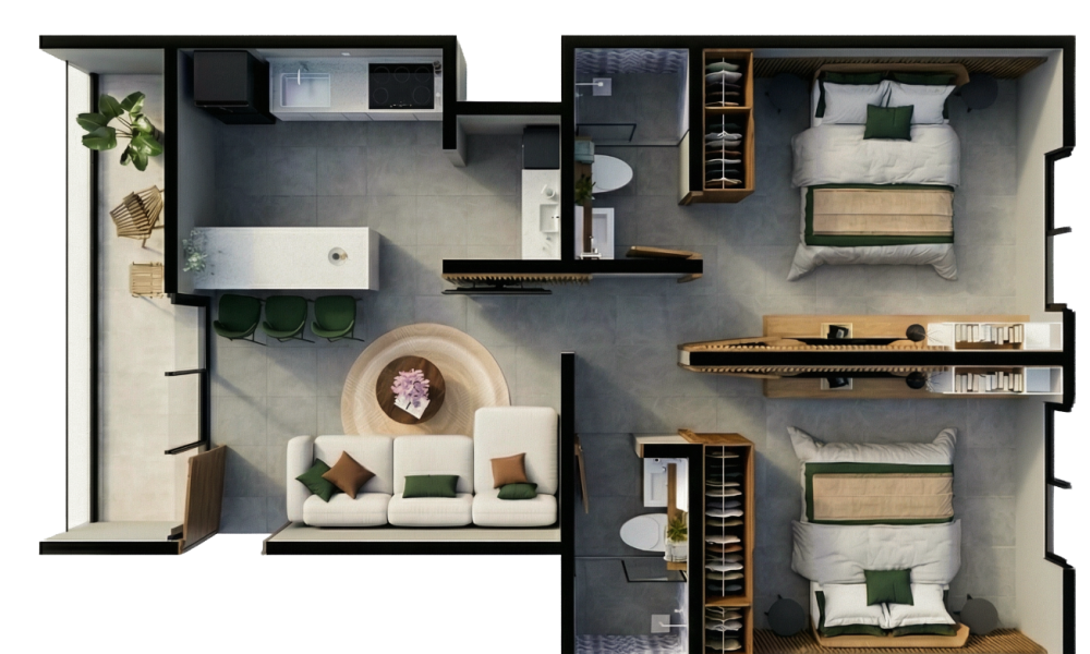 Inicial estará conformado de 72 departamentos distribuidos en dos torres con tres niveles cada una, además de un área comercial con 14 locales. Este modelo se caracteriza por contar con dos habitaciones, una de ellas con clóset vestidor.