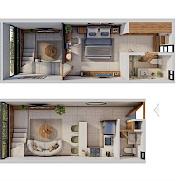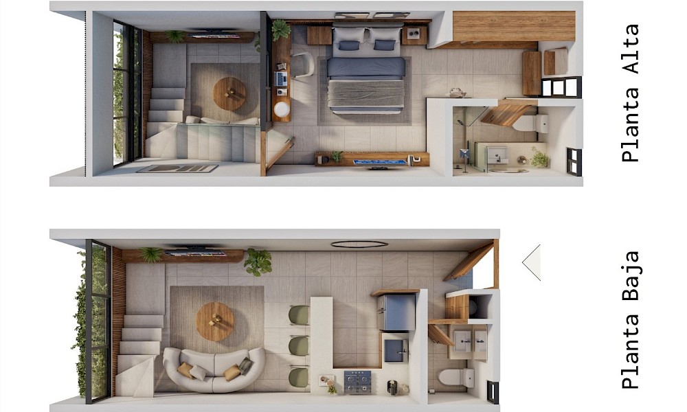 Este modelo está distribuido en dos plantas con la habitación en el segundo nivel y el área social en planta baja.