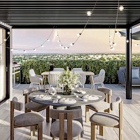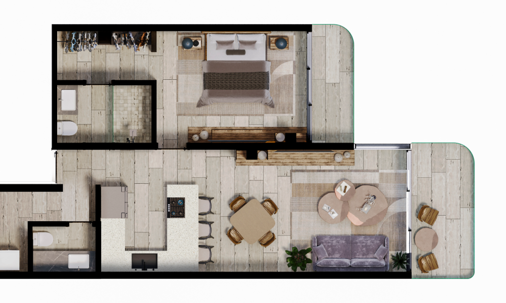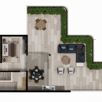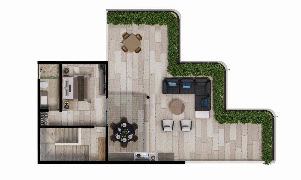 El penthouse B se caracteriza por contar con una distribución en dos niveles con dos habitaciones, una de ellas en el área de rooftop.