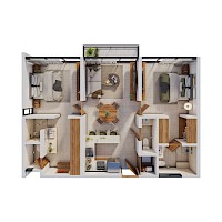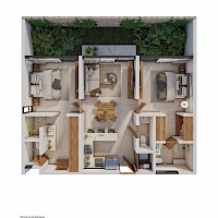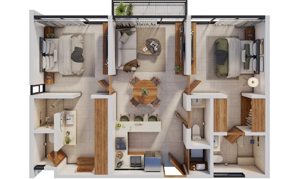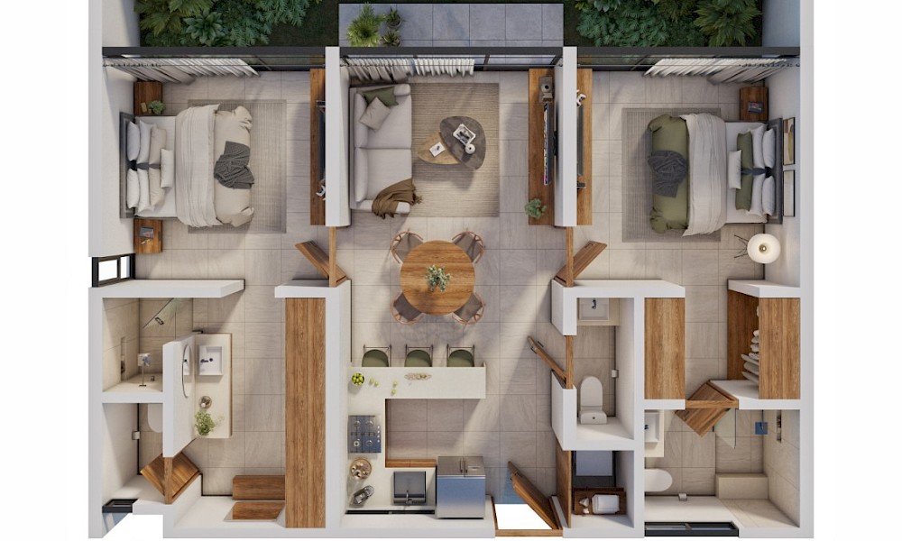 Este modelo cuenta con 2 habitaciones, cada una con baño propio y dependiendo la ubicación puede contar con área de jardín para la planta baja o balcón para el primer nivel.
