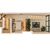 El loft Roya se caracteriza por la distribución de sus espacios bien aprovechados en dos plantas con una doble altura en el área de la sala, además de un espacio para "home office".