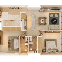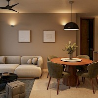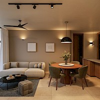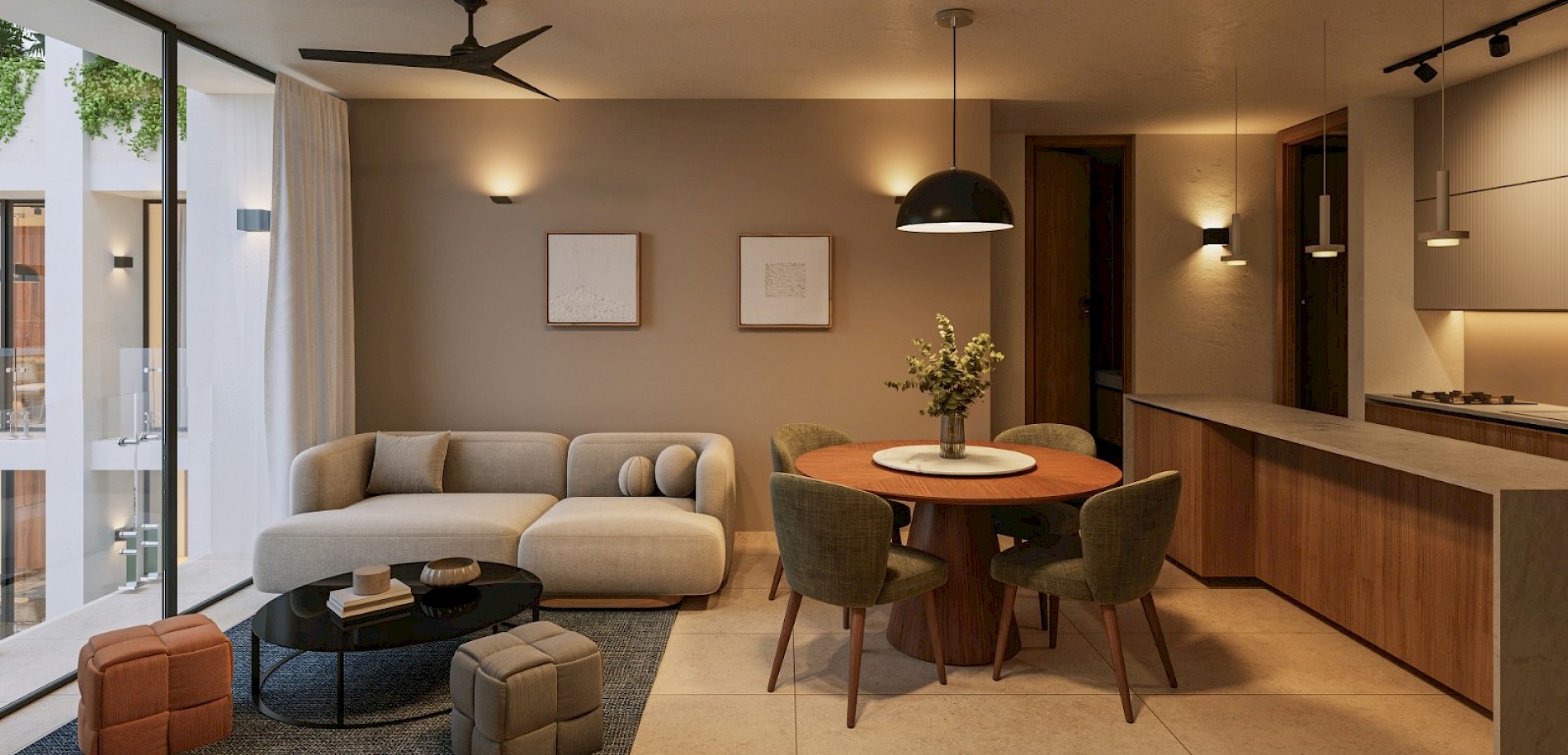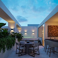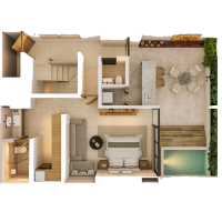 El penthouse Pouya se caracteriza por la distribución de sus espacios bien aprovechados en dos plantas con dos habitaciones en el primer nivel y la recámara principal en planta alta junto con el rooftop con terraza y piscina privada.