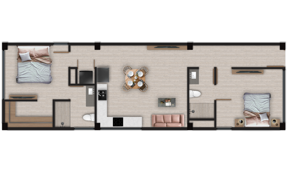El modelo C cuenta con dos habitaciones, la principal con espacio para clóset vestidor y baño propio.