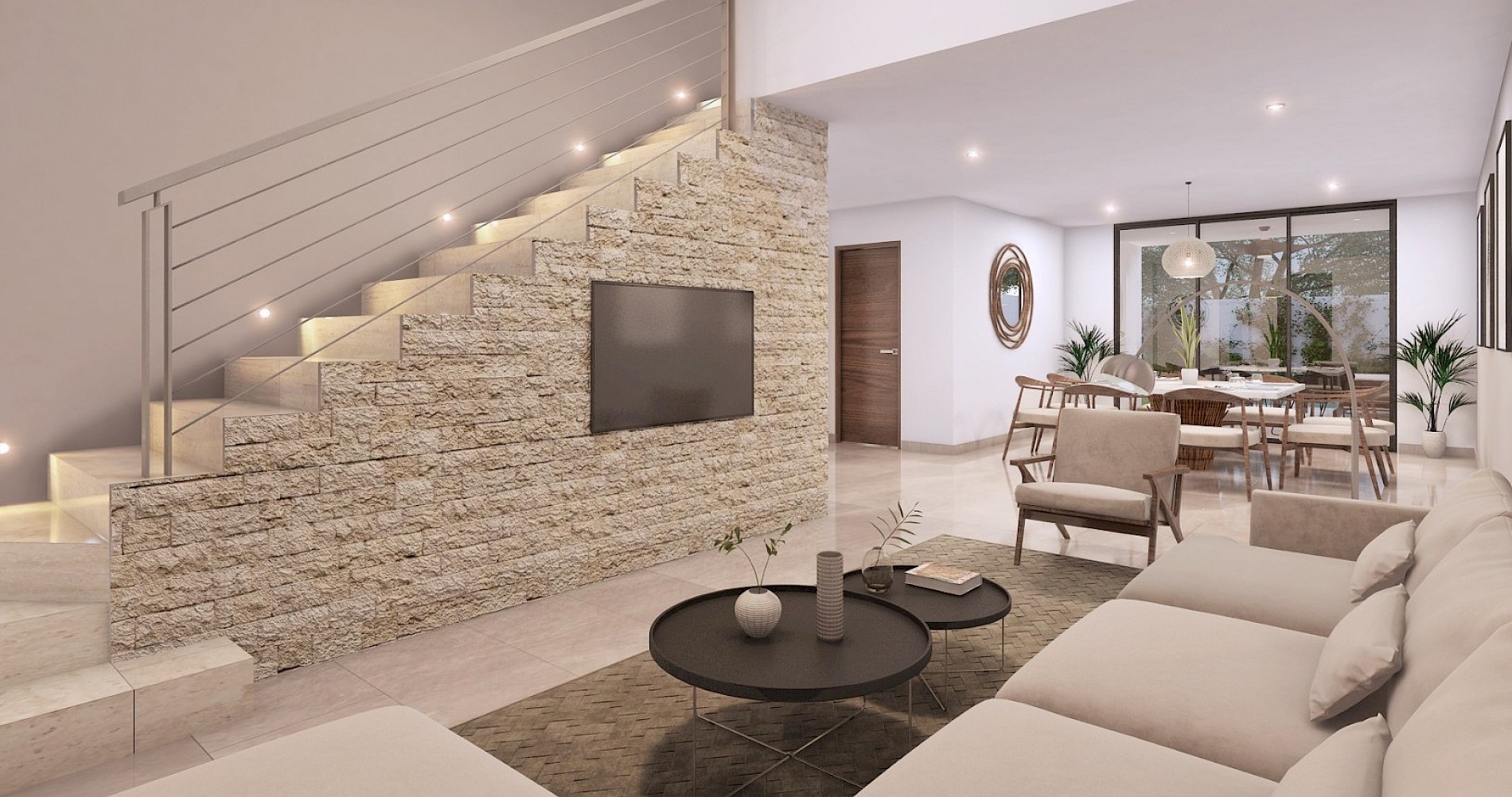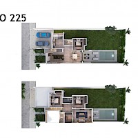 El modelo 225 se caracteriza por tener una distribución en dos plantas con cuatro amplias habitaciones, una terraza techada con vista a la piscina, además de la sala a altura y media.