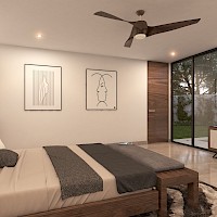Este modelo se caracteriza por contar con una distribución en una sola planta con tres amplias habitaciones, cada una con clóset vestidor.