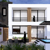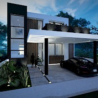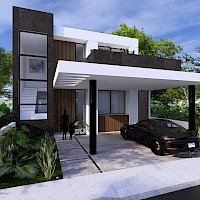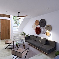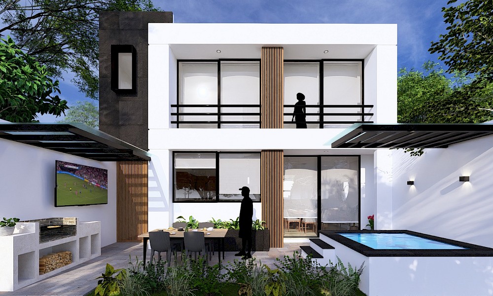 Este modelo se caracteriza por tener una sala a doble altura y tres amplias habitaciones en planta alta.