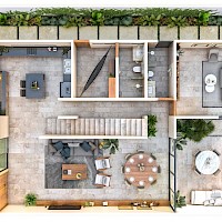 Este modelo se caracteriza por tener cuatro habitaciones, una de ellas en planta baja para mayor comodidad, además de una terraza semi techada en planta alta con una vista hermosa de la piscina.