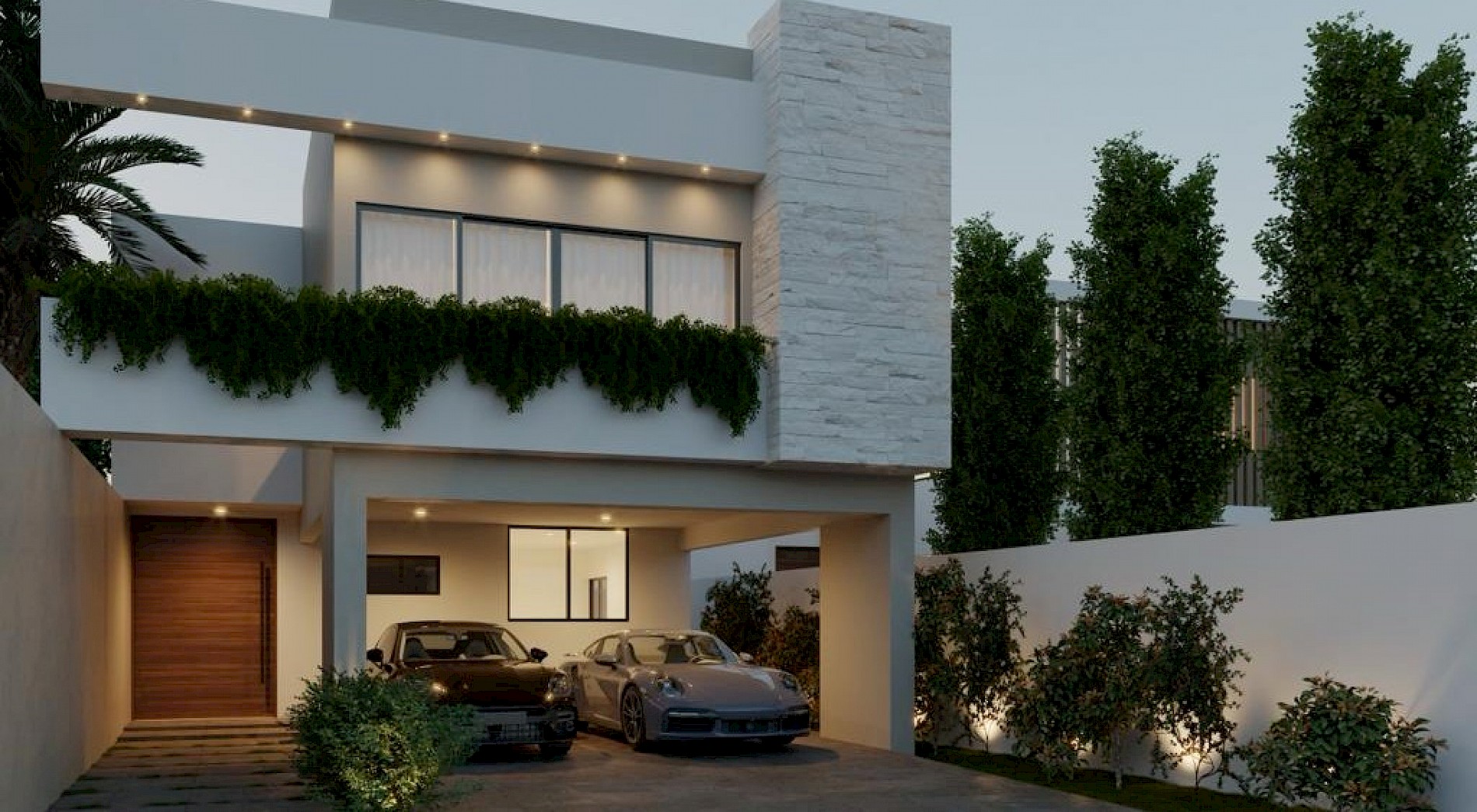 Este modelo se caracteriza por su armoniosa distribución en dos plantas, con cinco amplias habitaciones con baño completo, una de ellas en planta baja para mayor comodidad.