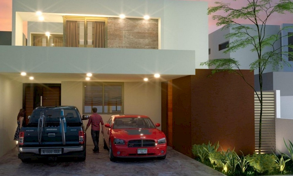 Este modelo se caracteriza por su armoniosa distribución en dos plantas, con tres habitaciones en planta alta, además de un family room.