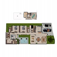 Este modelo se caracteriza por su armoniosa distribución en una planta con tres habitaciones y el área de servicio en el segundo nivel.