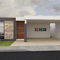 El modelo 185 se caracteriza por tener una distribución en una planta con tres amplias habitaciones y con cochera techada para dos vehículos.