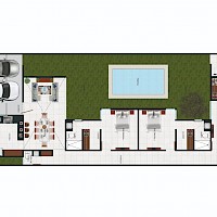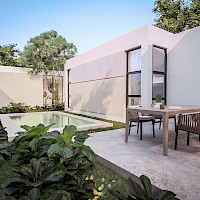 Este modelo se caracteriza por tener una distribución en una sola planta, con el área de sala-comedor a doble altura y vistas completas hacia el jardín, además de tres habitaciones completas, cada una con su baño.
