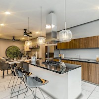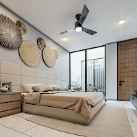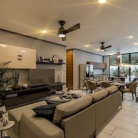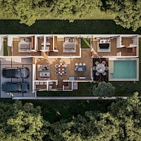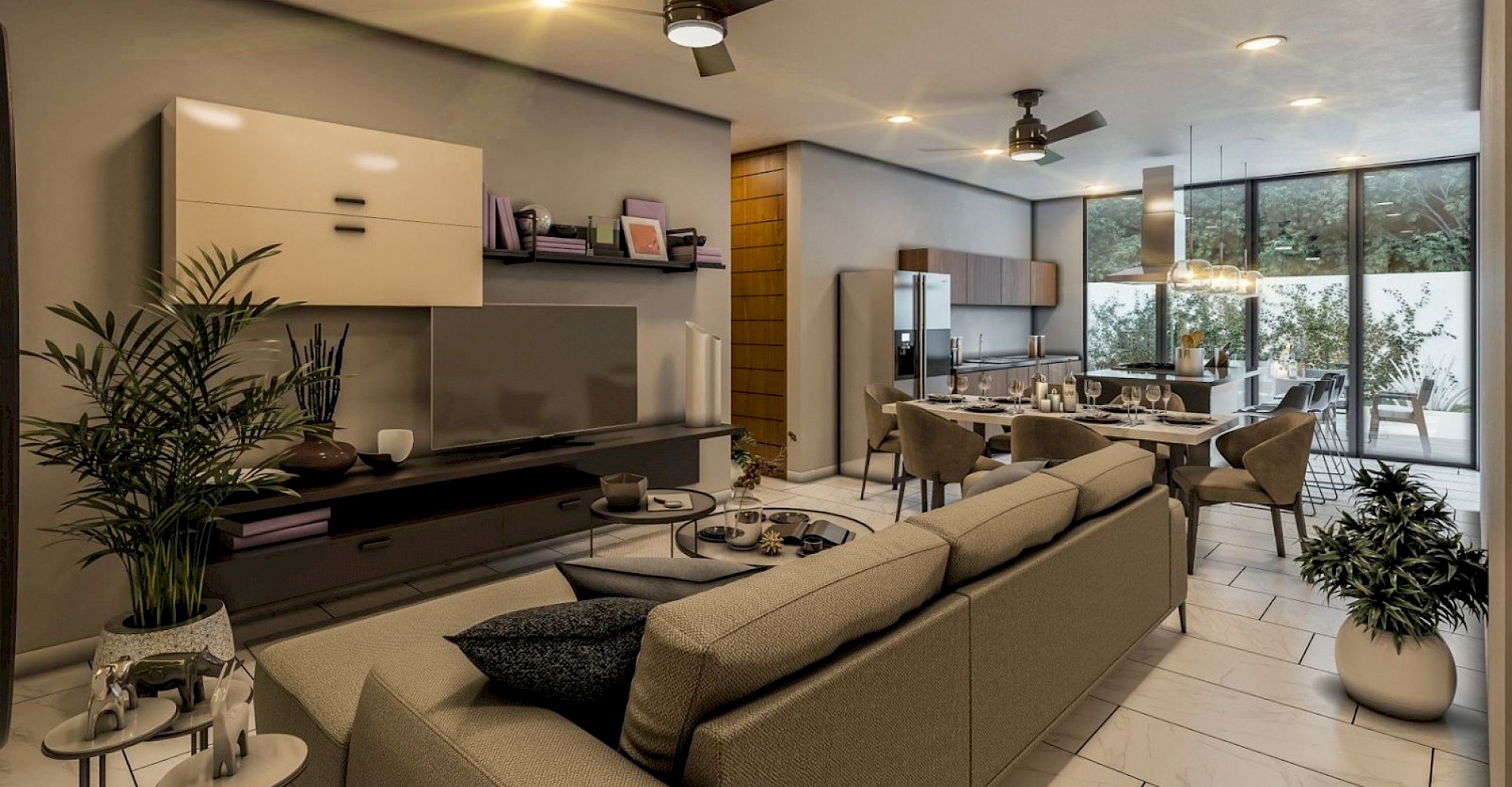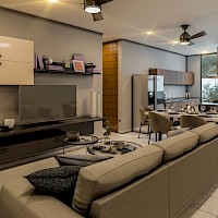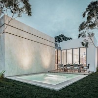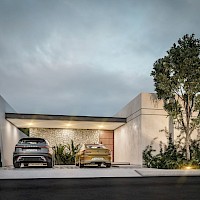 Este modelo se caracteriza por tener una distribución en una sola planta, con el área de sala-comedor a doble altura y vistas completas hacia el jardín, además de tres habitaciones completas, cada una con su baño.