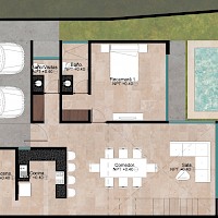 Esta opción se caracteriza por tener una habitación completa con baño en planta baja, además una espectacular doble altura en la zona de sala-comedor que nos brindará mayor amplitud y ventilación en el hogar.