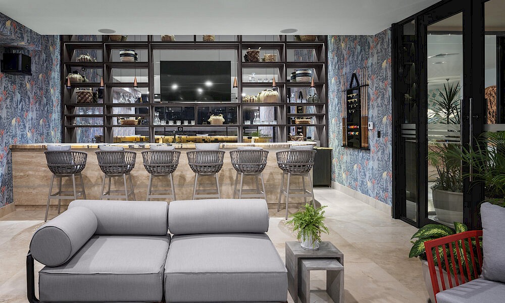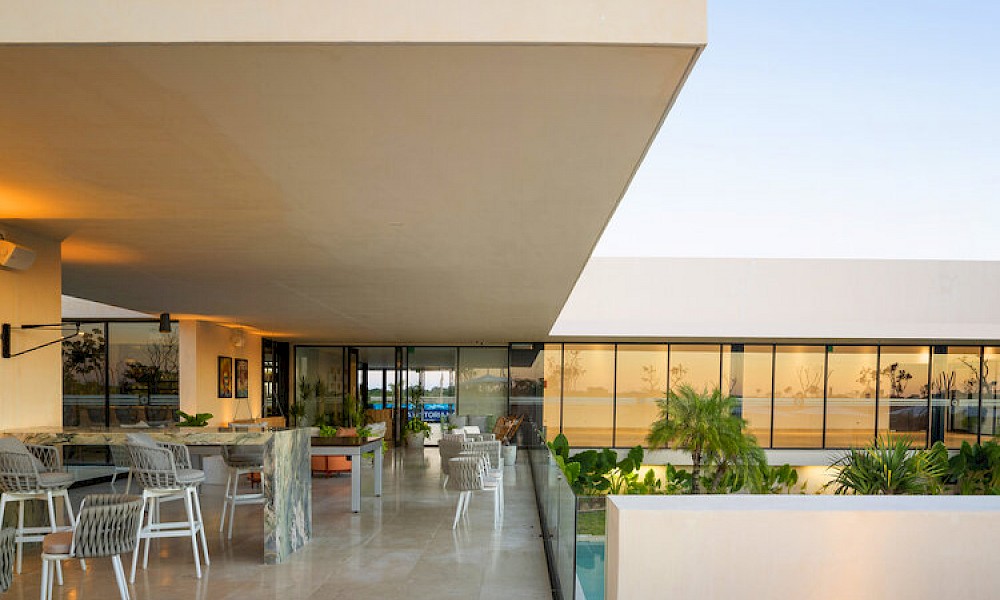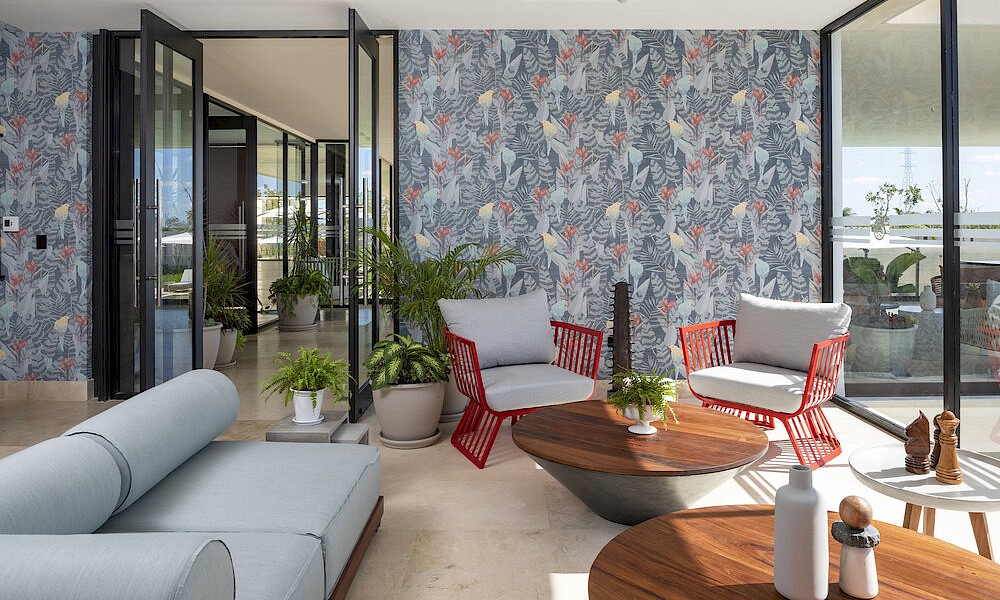 La privada cuenta con 2 casas club, zonas comerciales, parques recreativos y es una de las comunidades mejor planeadas del país. Esta residencia cuenta con tres habitaciones distribuidas en una planta con un área de sala-comedor a doble altura.