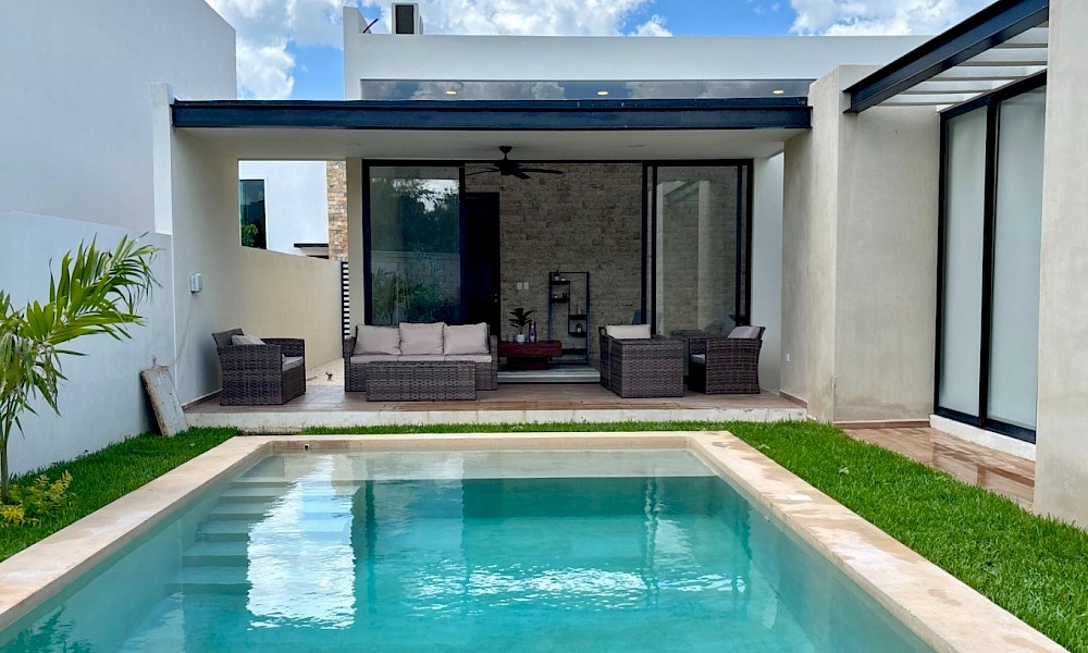 El modelo 270 se caracteriza por estar distribuido en una sola planta, tener tres amplias habitaciones, además de un área de jardín de buen tamaño.