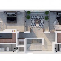 El townhouse contará con dos amplias habitaciones con clóset vestidor y una sala de TV, además de un acceso directo al parque central por medio de la terraza en la planta baja.