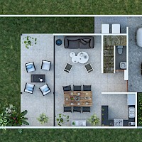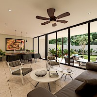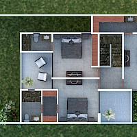 El modelo Areca se caracteriza por contar con tres habitaciones en planta alta y una terraza techada con vista al área de jardín.
