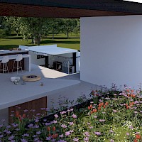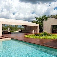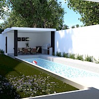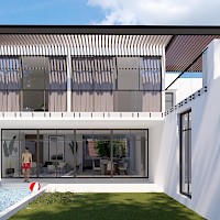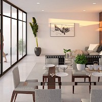 Este proyecto se caracteriza por estar distribuído en 2 niveles, sin embargo, en planta baja encontraremos: habitación principal, sala de tv/oficina, el área social, además de un bar muy cómodo que armoniza el área de la piscina con carril de nado.