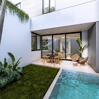 Preventa de villas en Antheria en una de las mejores zonas del norte de Mérida, Temozón. El desarrollo contará con seguridad a través de portón eléctrico, interfón y acceso peatonal con apertura remota vía celular, además el complejo estará conformado de 6 exclusivas villas.