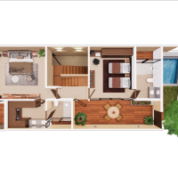 La villa está diseñada en un espacio de 2 niveles con dos habitaciones y una sala de TV, permitiendo un estilo de vida armónico en un entorno seguro y sano.