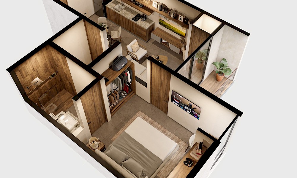 El modelo one cuenta con una amplia habitación con baño completo, clóset vestidor y jardín, además dependiendo de su ubicación dentro del edificio puede tener jardín o balcón.