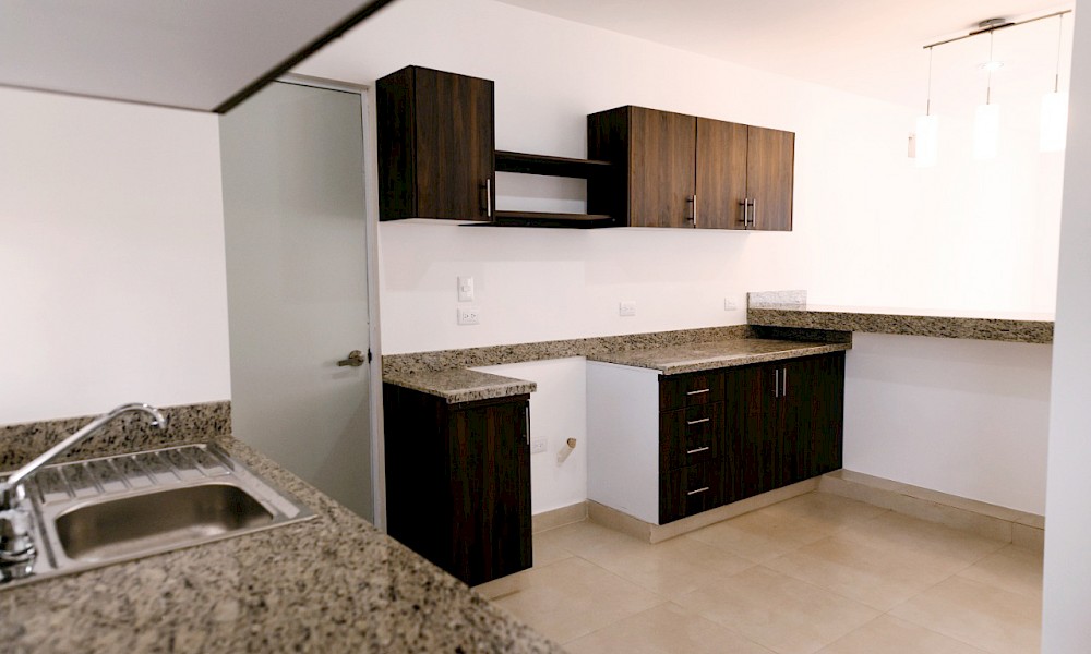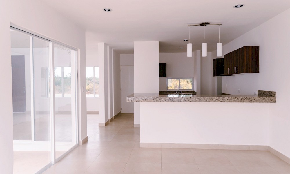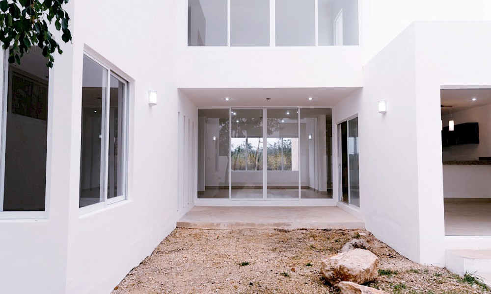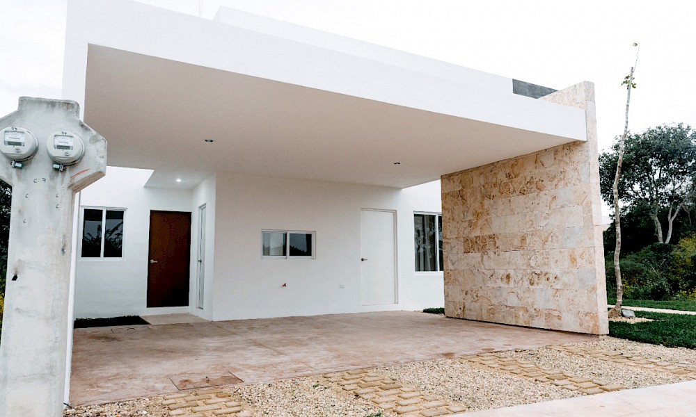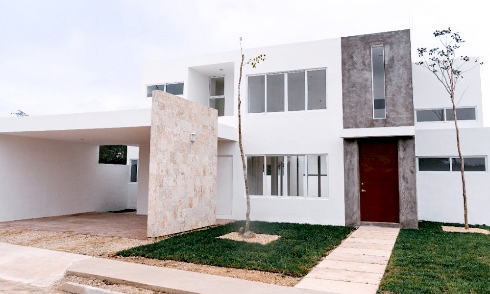 Este modelo se distingue por su diseño minimalista y fachada de piedra natural, así como amplios espacios en las habitaciones.