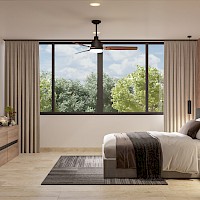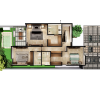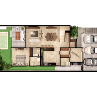 El modelo A0 se caracteriza por sus amplios espacios y distribución en dos niveles con cuatro habitaciones en planta alta, además de una piscina en el área de jardín.