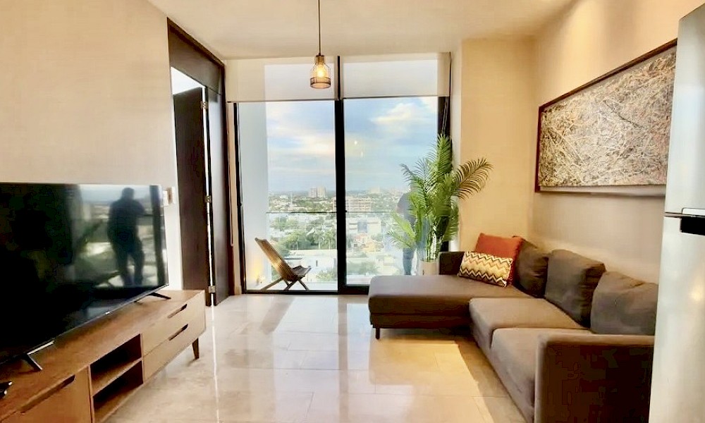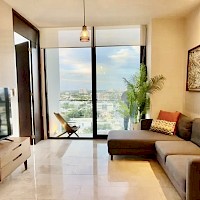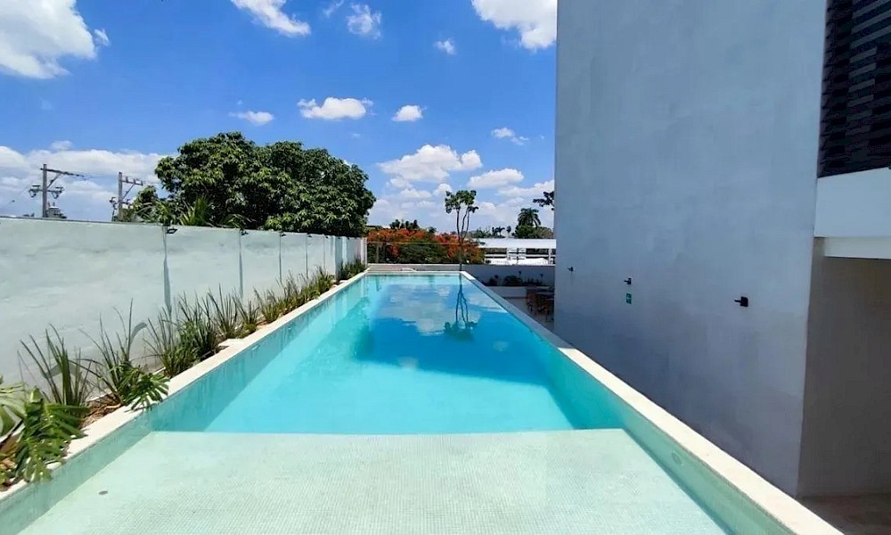 Departamento en venta en Nia Tower un edificio de usos mixtos que está conformado con 67 departamentos y espacios comerciales, ubicado al norte de la ciudad de Mérida a escasos minutos de plazas comerciales como y variedad de áreas de entretenimiento. Se encuentra sobre la avenida Cámara de Comercio dentro del anillo periférico. El desarrollo cuenta con amenidades y seguridad por medio de caseta de vigilancia las 24 horas del día.