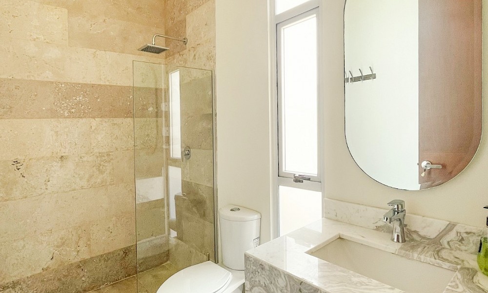 Este modelo se caracteriza por estar situado en planta baja, tener tres habitaciones con baño cada uno + el cuatro de servicio con baño y por gozar de una vista hacia el mar con una terraza cómoda, ideal para pasar las tardes de verano en familia.