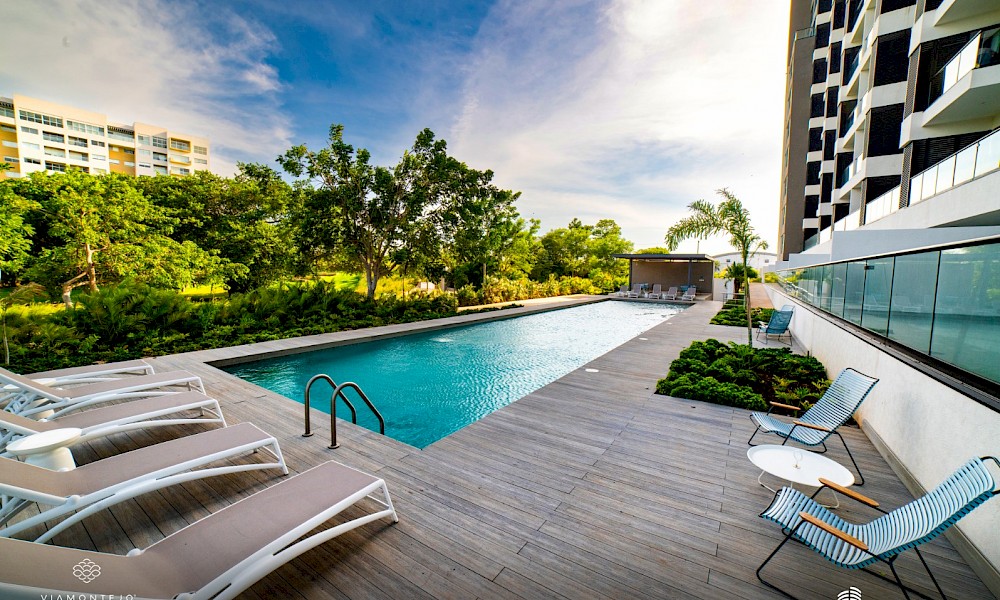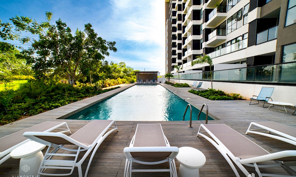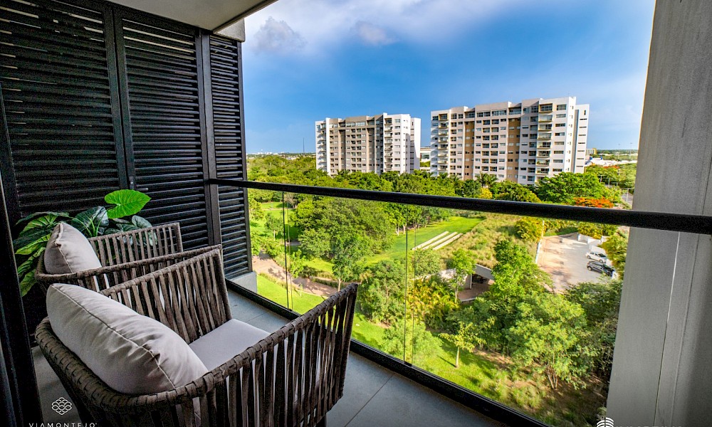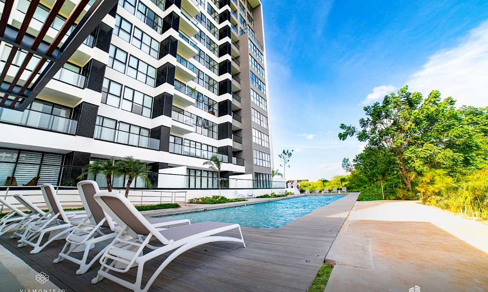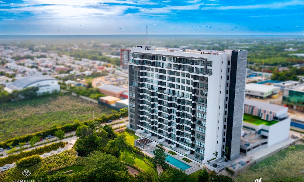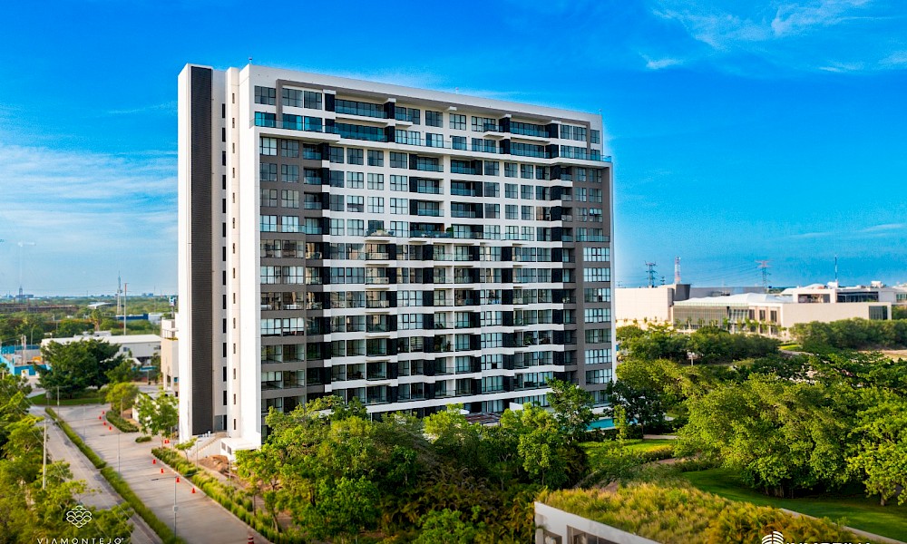 Venta de departamento en la torre Índico dentro del desarrollo Vía Montejo. El desarrollo residencial de 15 niveles está ubicado en Prolongación Paseo de Montejo, a escasos metros de todos los servicios de la ciudad. La torre de departamentos cuenta con seguridad por medio de control de acceso y cámaras de vigilancia.